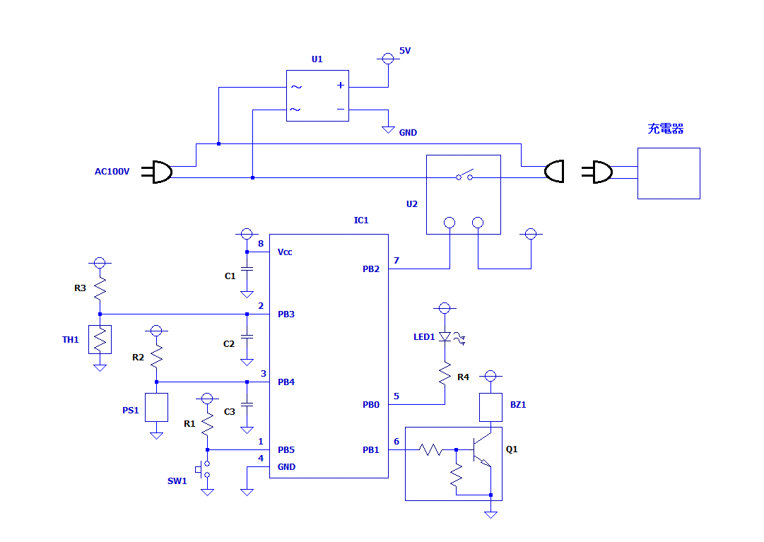 バッテリーパックの膨張、発熱を検知して、ブザーを鳴らして充電を停止する装置を作ってみることにした。