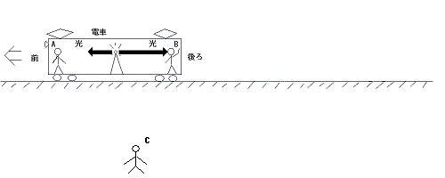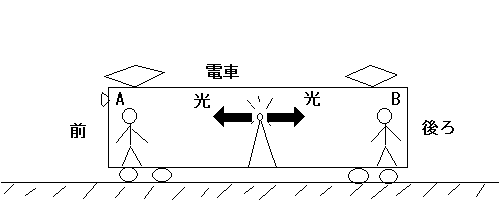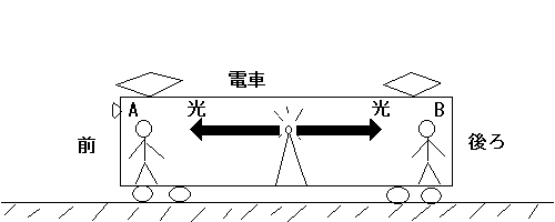 絵では、電車の前方に向かう光が後方に向かう光より遅いように見えますが、電車が動いているので、もし光の速度を同じ長さの矢印で表現したら、前方に向かう光の速度は、電車の速度+秒速30万kmとなって、相対性理論の「光速は誰が計測しても同じ」という大前提が崩れてしまいます。