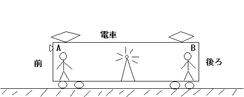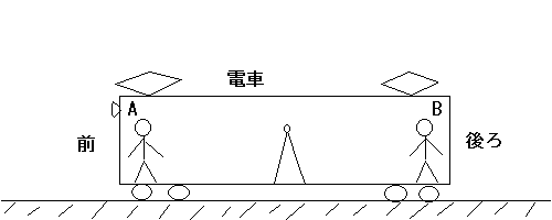 電車が左に走っている時、電車の中ではA君、B君が同時に手を上げた。