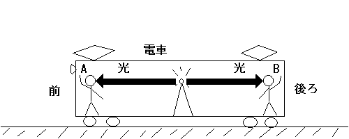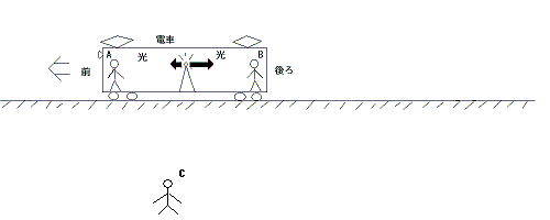 まず初めに、電車の中でこの実験を観測した場合について考えましょう。