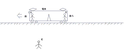 ここで、新たにC君に登場してもらい、電車の外からA君、B君の様子を観測してもらうことにする。