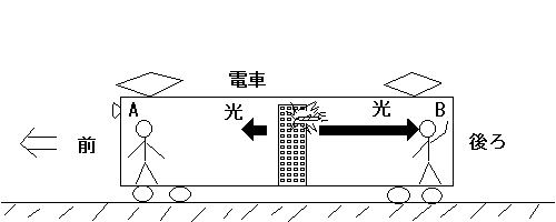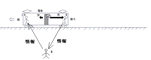 ならば、B君がA君に米国同時多発テロ事件が起きたことを教えてあげればよいではないか。いやダメダメ、電車の中では、B君とA君は、同じ時間を共有しているので、A君は、米国同時多発テロ事件が起きたことをB君と同時に知るのである。
