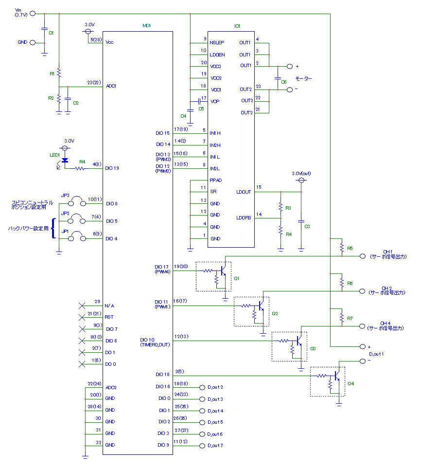 リポ1セル専用で、RCサーボ3CH、バック付きモータースピードコントローラ(スピコン)1CH、デジタル出力7CH(出力用トランジスタは1CHのみ実装)を駆動可能です。