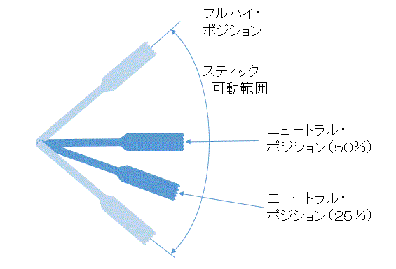 飛行機用などでバックパワーを0%にした場合のニュートラル・ポジションとは、モーターがON/OFFの境界をさします。