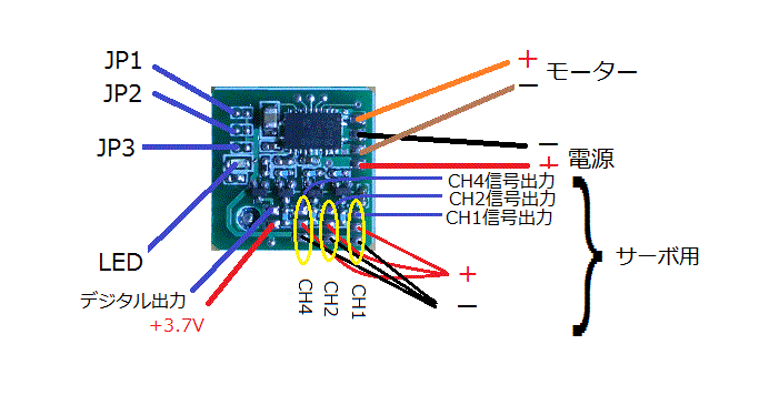 ●サーボ信号出力:3CH(送信機から見て1CH目、2CH目、4CH目に割り当て)