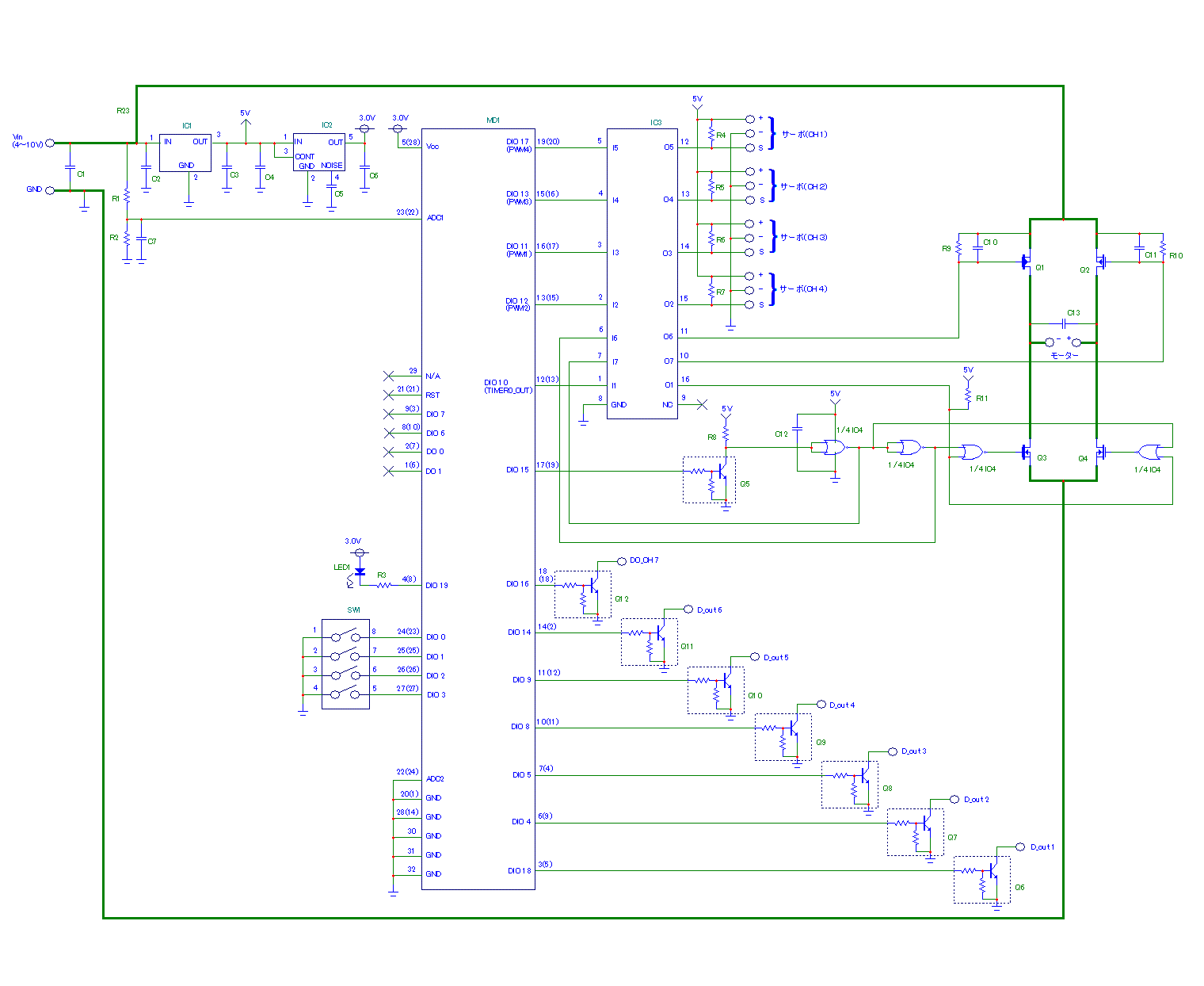 回路図中の太線は、動力用モーターの大電流ラインです。