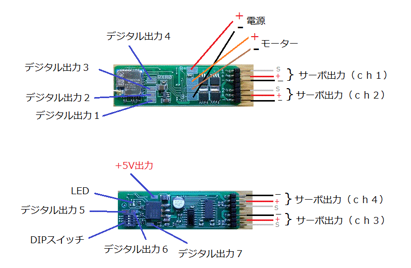 リポ2〜3セル専用で、RCサーボ4CH、バック付きモータースピードコントローラ(スピコン)1CH、デジタル出力7CHを駆動可能です。